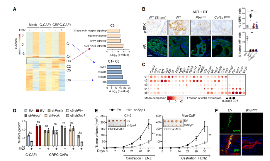 為了明確CRPC-CAFs作用于PCa細(xì)胞的機(jī)制,作者進(jìn)行差異表達(dá)基因聚類,分成6個(gè)cluster。有趣的是,Cluster3的基因在與CRPC-CAFs共培養(yǎng)時(shí)相對于C-CAFs明顯升高,通路分析表明Cluster3富集了參與MAPK-ERK(細(xì)胞外信號調(diào)節(jié)激酶)信號傳導(dǎo)的基因,基因集變異分析(GSVA)進(jìn)一步證明了這一點(diǎn)。根據(jù)scRNA-seq數(shù)據(jù)篩選到了CRPC-CAFs特異的分泌因子Spp1,結(jié)合實(shí)驗(yàn)驗(yàn)證表明去除分泌的磷蛋白1(Spp1)完全消除了CRPC-CAFs引起的抗雄激素作用,表明Spp1基因敲除表達(dá)有利于前列腺腫瘤的治療。