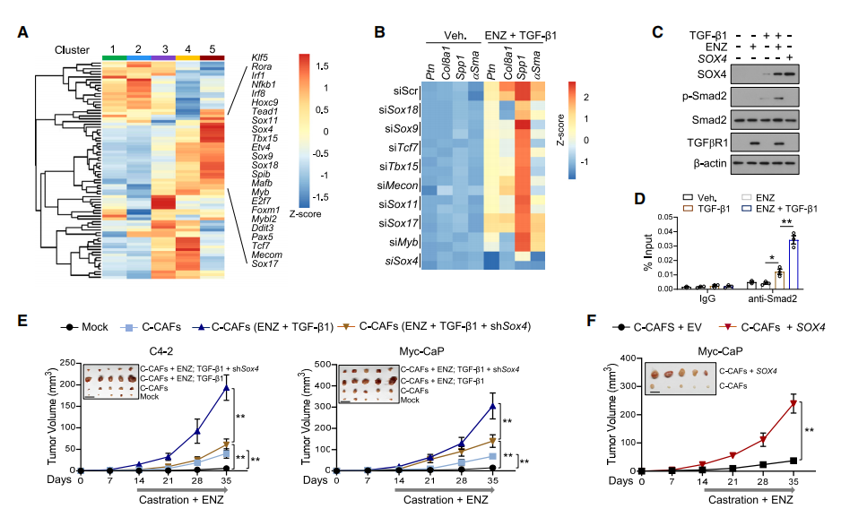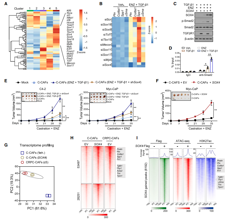 為了更好地理解ADT通過TGF-β信號通路形成CRPC-CAFs的機(jī)制,作者應(yīng)用scRNA-seq數(shù)據(jù),采用SCENIC算法,尋找CAFs狀態(tài)下的差異激活轉(zhuǎn)錄因子(TFs),選擇Sox11、Sox9、Sox4、Tbx15等并評估其功能,通過基因敲除實(shí)驗(yàn)發(fā)現(xiàn)Sox4 基因具有促進(jìn)胰腺癌腫瘤增大的功能,同時(shí)與ENZ和TGF-β1共處理時(shí),Smad2在Sox4基因座啟動(dòng)子區(qū)域的占用顯著增強(qiáng)。