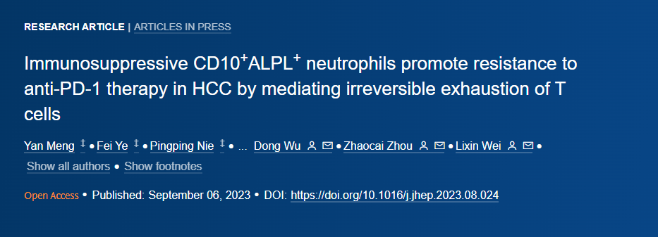 烈冰生物合作伙伴海軍軍醫(yī)大學(xué)東方肝膽外科醫(yī)院衛(wèi)立辛、吳東團隊與復(fù)旦大學(xué)周兆才、焦石團隊針對上述問題開展了系列研究,于近期在 Journal of Hepatology 期刊發(fā)表了題為Immunosuppressive CD10+ALPL+ neutrophils promote resistance to anti-PD-1 therapy in HCC by mediating irreversible exhaustion of T cells 的研究論文。烈冰生物參與了本研究中的單細胞測序和數(shù)據(jù)分析工作。