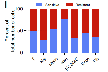 通過對不同樣本和分組的細胞類型進行統(tǒng)計,發(fā)現(xiàn)耐藥組中的中性粒細胞占比明顯低于響應(yīng)組,而巨噬細胞占比則明顯高于響應(yīng)組。