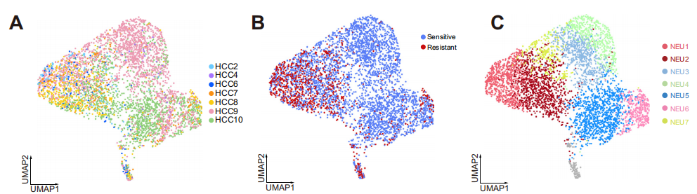 研究者對7例計劃進行抗PD-1治療的肝細胞癌患者活檢組織進行了單細胞測序,根據(jù)mRECIST標(biāo)準(zhǔn),將患者分為抗PD -1敏感組和抗PD -1耐藥組,通過scRNA-seq來評估免疫、腫瘤和基質(zhì)細胞的特性。為了保證后續(xù)分析的可靠性,研究者與烈冰的生信團隊對數(shù)據(jù)進行嚴(yán)格的質(zhì)控,最終得到31,672個細胞。通過細胞聚類分析,共鑒定出7個細胞大類,并使用CNV分析,對腫瘤細胞進行惡性評分。
