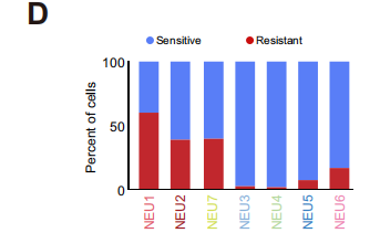 考慮到中性粒細胞在兩組中出現(xiàn)明顯的占比區(qū)別,研究者將4,596個中性粒細胞(約占總細胞的14.5%)進行重聚類,得到7個亞群(NEU1-NEU7)。其中,NEU1主要存在于耐藥組中,高表達免疫抑制的基因,富集抑制免疫功能的通路,且高表達JAML和CD170兩個顯著代表前體中性粒細胞免疫抑制功能的基因;而NEU3–6亞群表主要表達抗腫瘤免疫的基因,且PDL1在NEU3和NEU4中特異性富集。