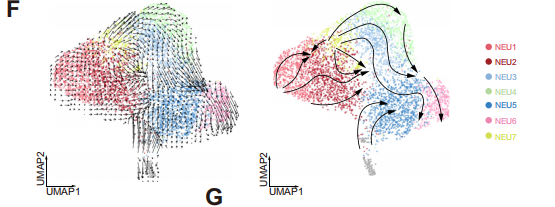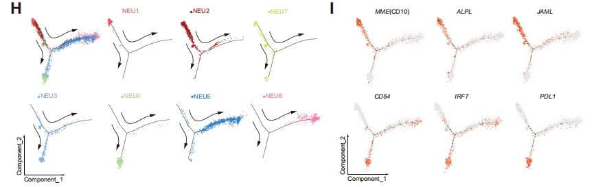 為了研究NEU1細胞和其他細胞群體之間關(guān)系,研究人員進行了速率分析和擬時序分析,發(fā)現(xiàn)NEU1 群體位于發(fā)育的起點,且特異性表達CD10、ALPL、JAML基因。因此將NEU1細胞群體命名為CD10+ALPL+ NEU。
