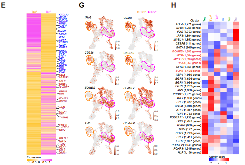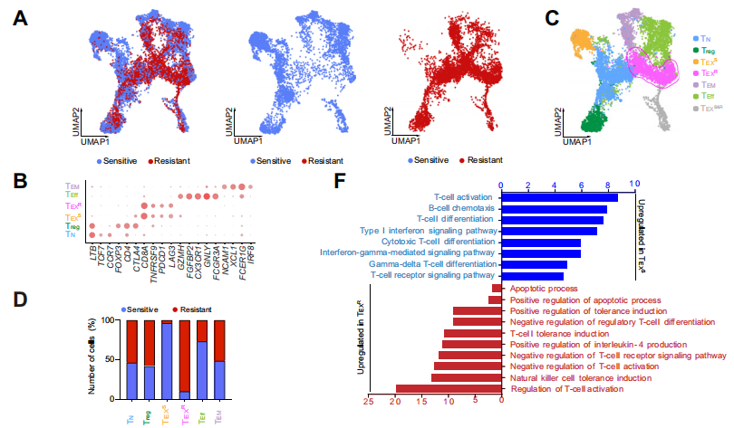 通過進行SCENIC分析,研究人員進一步比較了敏感組和耐藥組轉(zhuǎn)錄因子的活性,發(fā)現(xiàn)TEXS細胞中明顯豐富的EOMES活性,據(jù)報道,EOMES可介導(dǎo)耗竭T細胞分化和持續(xù)的T細胞衰竭。表明抗PD -1耐藥患者的TEXR細胞可能處于衰竭狀態(tài),且這種耗竭是不可逆的。