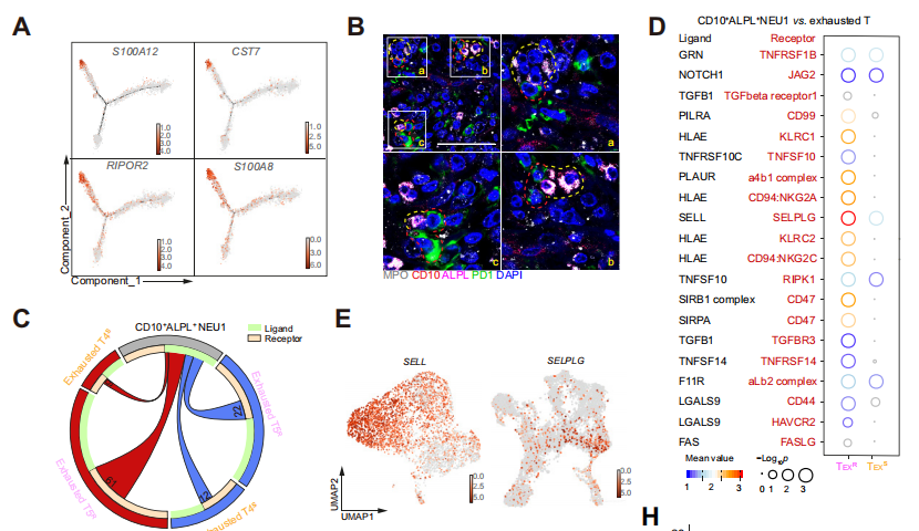 為了深入了解CD10+ALPL+ NEUs與T細胞之間的調(diào)控關(guān)系,研究人員進行了細胞-細胞相互作用分析(CellPhoneDB)。結(jié)果表明,耐藥患者中分析到CD10+ALPL+ NEUs和TEX細胞之間的相互作用是敏感組的兩倍。