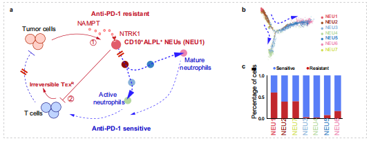 總的來說,腫瘤細胞通過NAMPT-NTRK1信號通路對CD10+ALPL+ NEUs進行重編程,維持未成熟狀態(tài),抑制CD10+ALPL+ NEUs的成熟和激活,而CD10+ALPL+ NEUs使T細胞處于不可逆的耗竭狀態(tài),導(dǎo)致了患者產(chǎn)生耐藥性。