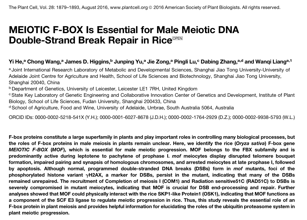 He, Y. et al. MEIOTIC F-BOX Is Essential for Male Meiotic DNA Double-Strand Break Repair in Rice. Plant Cell.2016 Aug;28(8):1879-1893.(IF=8.688)