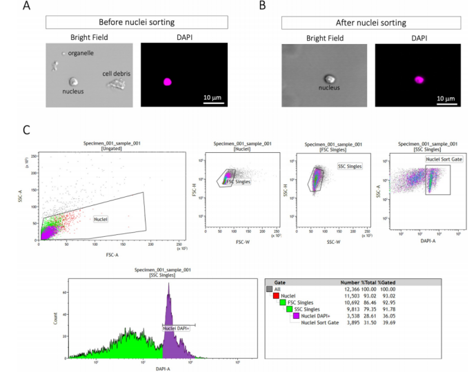 如上操作方法盡量減少了葉綠體等細(xì)胞器的污染和可能堵塞微流控芯片的細(xì)胞碎片,從制核結(jié)果來看,研究者獲得了40000個(gè)DAPI+核(總回收體積67-70μl),可用于后續(xù)單細(xì)胞核測序?qū)嶒?yàn)。