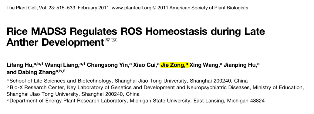 Hu L, et al. Rice MADS3 Regulates ROS Homeostasis during Late Anther Development. Plant Cell.?2011 Feb;23(2):515-33. (IF=10.224)