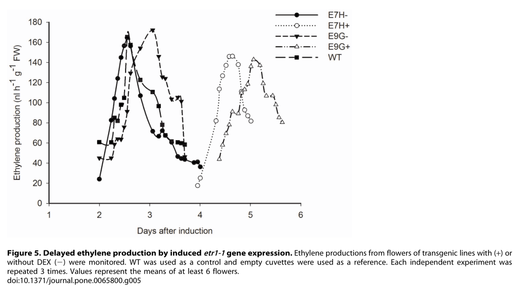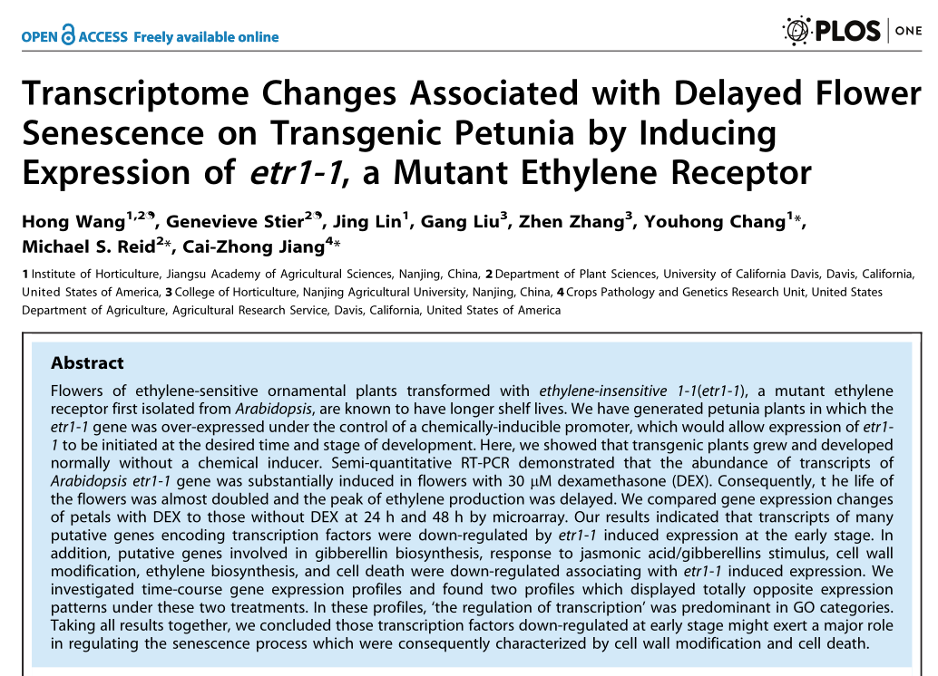 Wang H, et al. Transcriptome Changes Associated with Delayed Flower Senescence on Transgenic Petunia by Inducing Expression of etr1-1, a Mutant Ethylene Receptor. PLoS One.?2013 Jul 9;8(7):e65800. (IF=4.375)