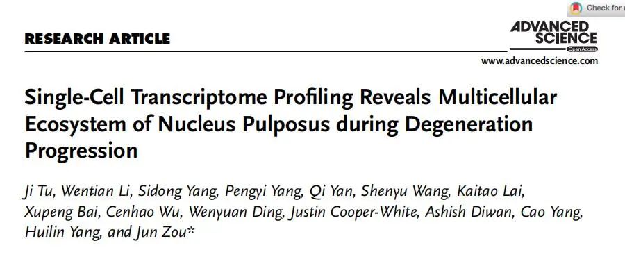本期,小編就來介紹一下蘇州大學(xué)第一附屬醫(yī)院鄒俊老師研究團(tuán)隊(澳大利亞新南威爾士大學(xué)涂計博士,李文甜博士,澳大利亞昆士蘭大學(xué)楊思東博士,共同第一作者)發(fā)表在Advanced Science(IF=16.802)上的文章,題目為Single-Cell Transcriptome Profiling Reveals Multicellular Ecosystem of Nucleus Pulposus during Degeneration Progression。這篇文章利用單細(xì)胞測序等技術(shù),揭示了髓核在椎間盤退行性變中的發(fā)生進(jìn)程。