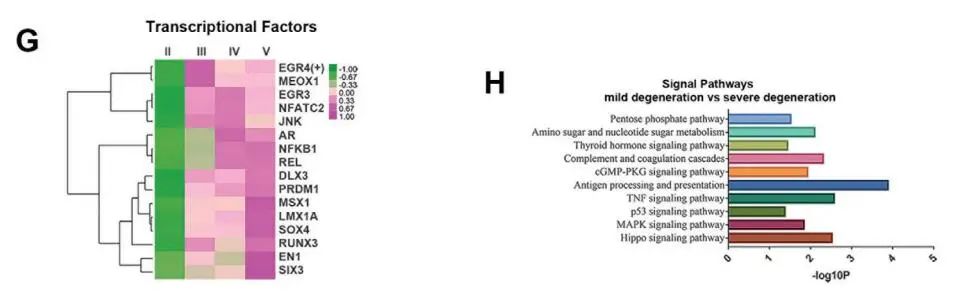 接下來作者分析了不同級別IVDD患者的轉(zhuǎn)錄本信息,鑒定出了一系列與退行性程度相關(guān)的轉(zhuǎn)錄因子(LMX1A、PRDM1、REL等)。隨后,作者利用差異表達(dá)基因分析,GO Pathway富集分析,發(fā)現(xiàn)了與IVDD發(fā)展級別相關(guān)的基因(HSPH1、CTGF、MMP13、HSP90AA1),在重度IVDD患者中熱休克蛋白基因(HSPA1B、HSPH1、HSP90AA1等)顯著上調(diào),說明了stress-related機(jī)制在IVDD中的重要性。此外,作者還發(fā)現(xiàn)了一系列可能會引起退行性發(fā)生的通路,包括抗原加工和呈遞通路、TNF通路、MAPK通路及Hippo通路等。