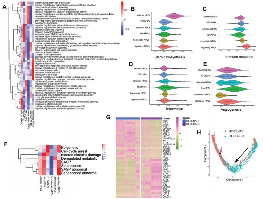 基于已有研究:神經(jīng)支配,血管生成和細(xì)胞衰老與IVDD的發(fā)生相關(guān)。為了分析亞群之間的功能差異,作者利用GO富集分析,發(fā)現(xiàn)在血管生成方面,fibroNPCs占比最高。而后作者利用QuSAGE分析、SCENIC分析,發(fā)現(xiàn)regulatory NPCs中高表達(dá)的基因(CXCL3、IL-6和CHI3L1)參與了細(xì)胞炎癥和內(nèi)源性刺激的反應(yīng),表明該細(xì)胞亞型可能具有調(diào)節(jié)免疫的功能;homeostatic NPCs中與細(xì)胞內(nèi)平衡相關(guān)(翻譯調(diào)控和蛋白質(zhì)/RNA代謝)的基因高表達(dá);adhesion NPCs具有細(xì)胞遷移和細(xì)胞基質(zhì)黏附作用;HT-CLNPs中與細(xì)胞周期阻滯和衰老相關(guān)的基因表達(dá)活躍,且鑒定了HT-CLNP-Ⅰ和HT-CLNP-Ⅱ,作者又利用擬時序分析揭示了HT-CLNP-Ⅰ和HT-CLNP-Ⅱ的演化進(jìn)程。