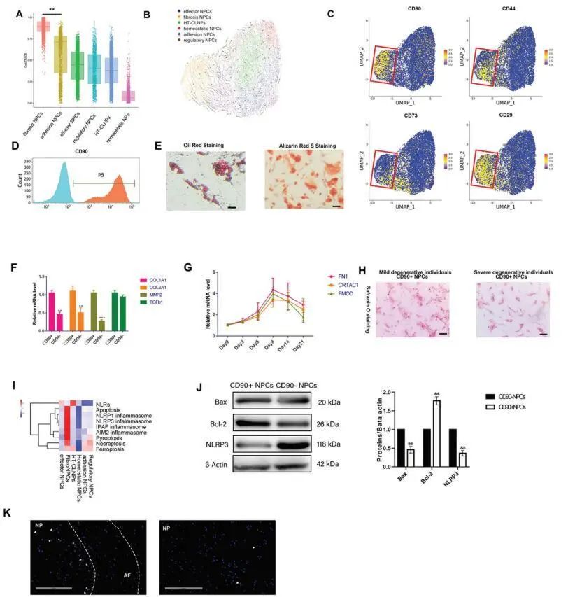 接下來,作者研究了不同細(xì)胞亞群之間的關(guān)系并利用細(xì)胞軌跡重建分析揭示了細(xì)胞分化方向和細(xì)胞譜系軌跡。細(xì)胞間的分化順序為fibroNPCs、adhesion NPCs、effector NPCs、regulatory NPCs、HT-CLNP和homeostatic NPCs。另外,研究者利用scVelo軌跡分析發(fā)現(xiàn),fibroNPCs具有分化成其他亞型細(xì)胞的潛力,是主要的終末期髓核細(xì)胞,表明fibroNPCs具有干細(xì)胞特性。進(jìn)一步,基于細(xì)胞亞群劃分和基因表達(dá)情況,作者發(fā)現(xiàn)CD90在fibroNPCs中特異性表達(dá),推測CD90+NPCs是fibroNPCs的主要干細(xì)胞群體。最后,作者利用實時熒光技術(shù),細(xì)胞培養(yǎng)技術(shù),染色技術(shù),免疫熒光技術(shù)等驗證了fibroNPCs可促使NP退變。