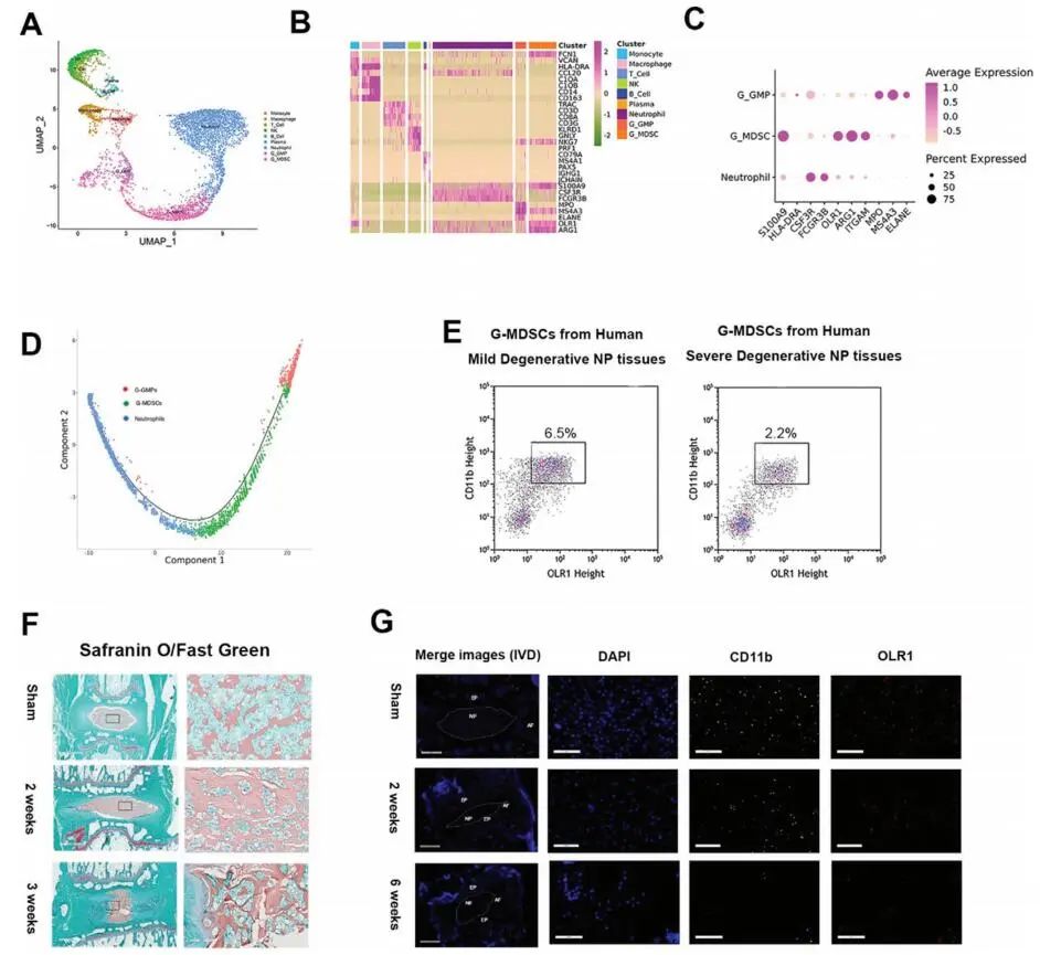 在NP中除了有髓核細(xì)胞外,還有免疫細(xì)胞,作者共鑒定出了9種類型免疫細(xì)胞,包括單核細(xì)胞和巨噬細(xì)胞(marker為CD163),中性粒細(xì)胞(marker為FCGR3B (CD16b) 和 HLADR),GMPs細(xì)胞(marker為MS4A3, MPO, ELANE),NK細(xì)胞(marker為CD94),粒細(xì)胞性髓系源性抑制細(xì)胞(G-MDSCs marker為ITGAM(CD11b), OLR1, ARG1)等。而后作者利用擬時序分析,預(yù)測了免疫細(xì)胞的分化方向是從GMPs,G-MDSCs到中性粒細(xì)胞。進(jìn)一步,作者通過流式分選技術(shù)分離出CD45+CD11b+OLR1+ CD24+/-的G-MDSCs,發(fā)現(xiàn)輕度退行性NP組織中的G-MDSCs約是重度的3倍。在大鼠模型中利用免疫組化和免疫熒光進(jìn)行驗證,也發(fā)現(xiàn)G-MDSCs在重度模型中的減少。