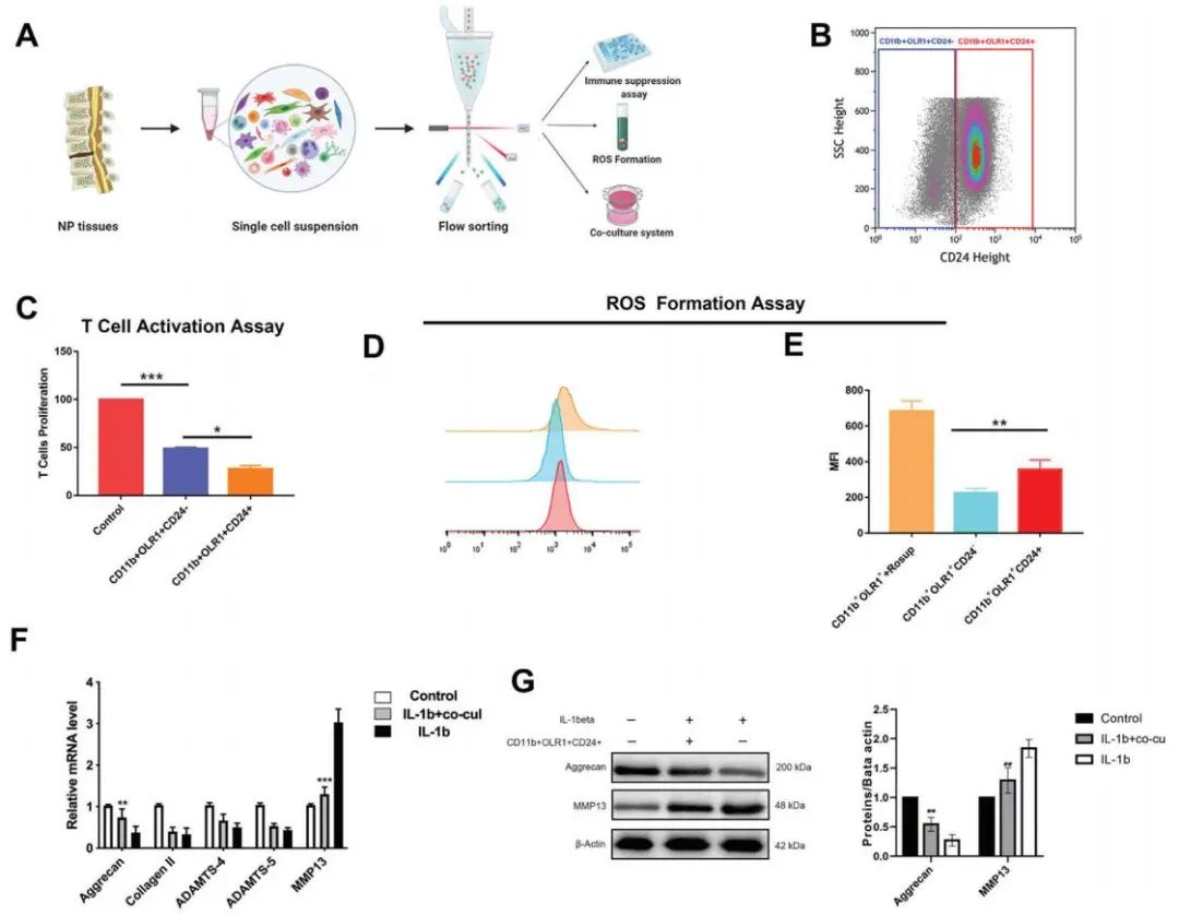 基于上述研究結(jié)論,作者推測G-MDSCs細(xì)胞在IVDD病程發(fā)展中至關(guān)重要。隨后,作者通過流式分選技術(shù)分離出CD45+CD11b+OLR1+CD24+/-的兩群G-MDSCs,利用免疫抑制實驗和活性氧(ROS)檢測技術(shù)及細(xì)胞共培養(yǎng)等技術(shù),對G-MDSCs的進(jìn)行功能驗證,結(jié)果發(fā)現(xiàn)G-MDSCs具有免疫抑制細(xì)胞和ROS產(chǎn)生的能力,其中CD24+的免疫抑制能力和ROS產(chǎn)生更強(qiáng)。另外有研究表明白細(xì)胞介素(IL-1β)可誘導(dǎo)髓核NP退行性發(fā)生。作者將G-MDSCs與NPCs共培養(yǎng)(加入IL-1β),發(fā)現(xiàn)聚集蛋白聚糖(髓核中主要的蛋白多糖)有所增加,而與退行性進(jìn)程相關(guān)的基因(MMP13)表達(dá)下降,這表明G-MDSCs可緩解IL-1β介導(dǎo)的NPCs的退變。