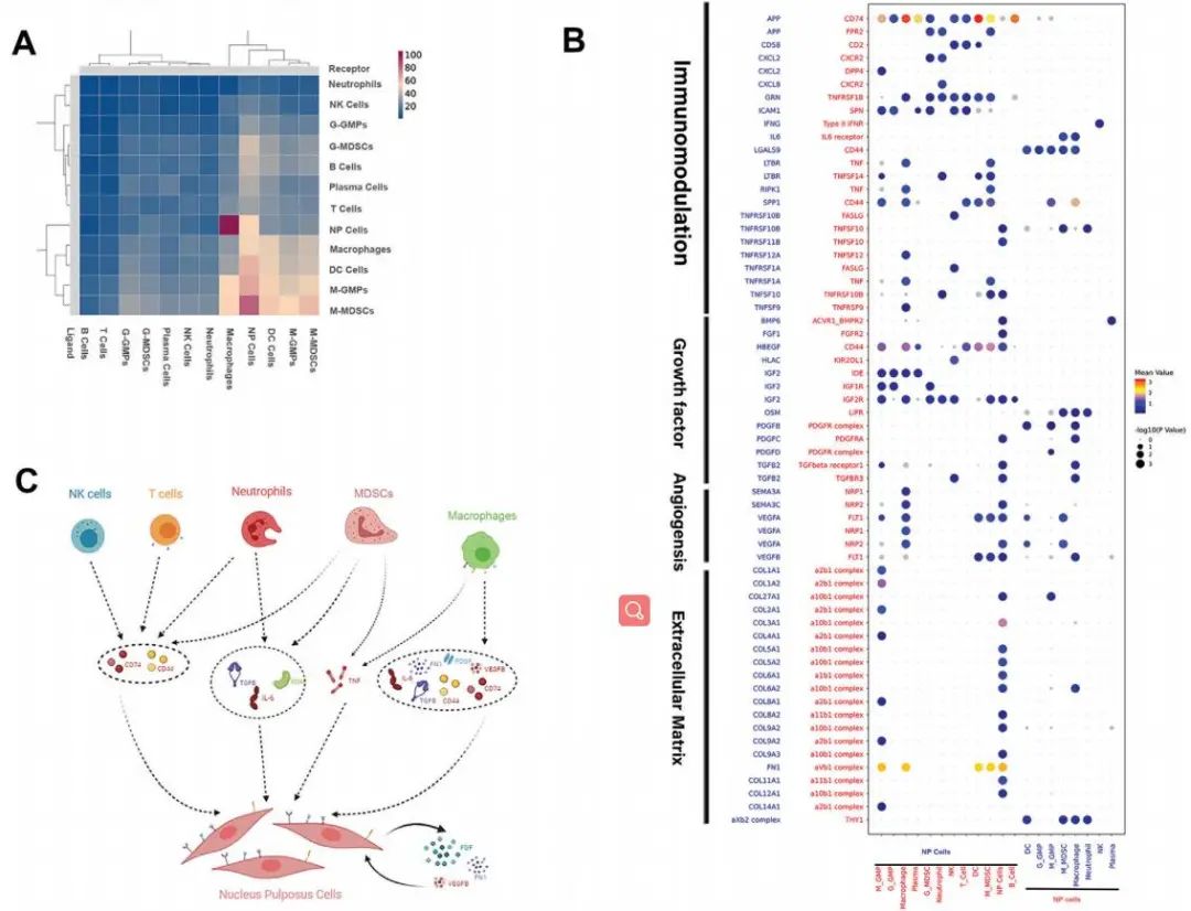 最后,作者利用細(xì)胞通訊分析探究了細(xì)胞間的相互作用,結(jié)果發(fā)現(xiàn)巨噬細(xì)胞與其他類型細(xì)胞的相互作用最多,而NPCs間的相互作用最為活躍。對免疫細(xì)胞與退行性NPCs間的通訊網(wǎng)絡(luò)預(yù)測發(fā)現(xiàn),NPCs上的受體(FN1,F(xiàn)GF)與免疫調(diào)節(jié)相關(guān)的細(xì)胞因子(TNF, IL-6, PDGF, TGFB等)存在相互作用。以上結(jié)果表明免疫細(xì)胞和NPCs在NP中的發(fā)揮著重要的調(diào)節(jié)作用,例如炎癥平衡,細(xì)胞增殖和血管生成等。