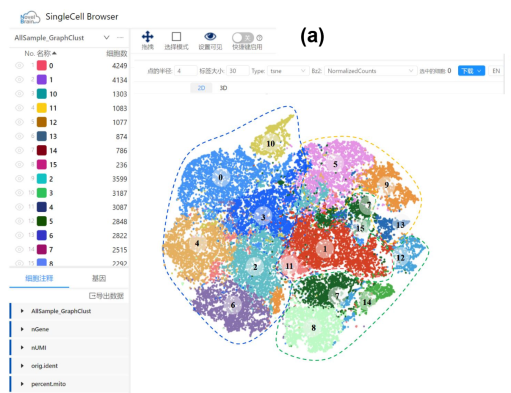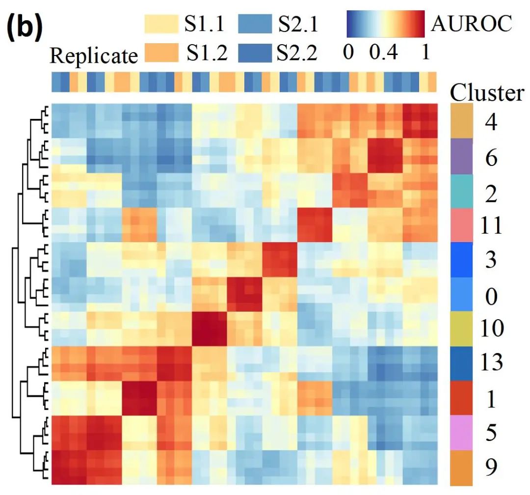 利用NovelBrain®生物信息分析云平臺,烈冰生信專家團隊對37571個高質(zhì)量細胞的單細胞轉(zhuǎn)錄組數(shù)據(jù)進行了無偏聚類分析,共劃分為16個群體(Cluster)并利用單細胞瀏覽器對t-SNE圖進行了可視化展示(圖1a),隨后,基于AUROC分析(圖2b)、 皮爾森相關性分析和細胞占比統(tǒng)計等多種分析證明,S1和S2兩個重復樣本中細胞群體高度一致和數(shù)據(jù)的可靠性。