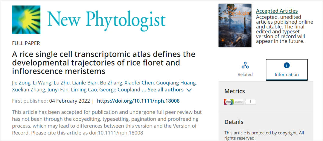 2022年2月4日,NEW PHYTOLOGIST在線發(fā)表了上海交通大學生命科學技術學院袁政教授團隊和烈冰團隊通力合作的水稻花序單細胞文章,對水稻花序組織中細胞的分化發(fā)育進行了全面剖析。