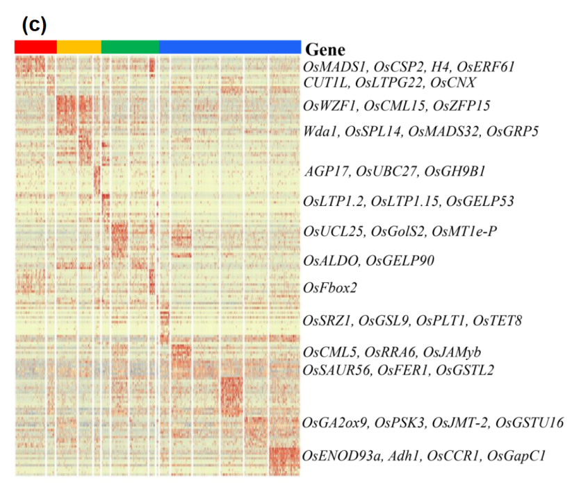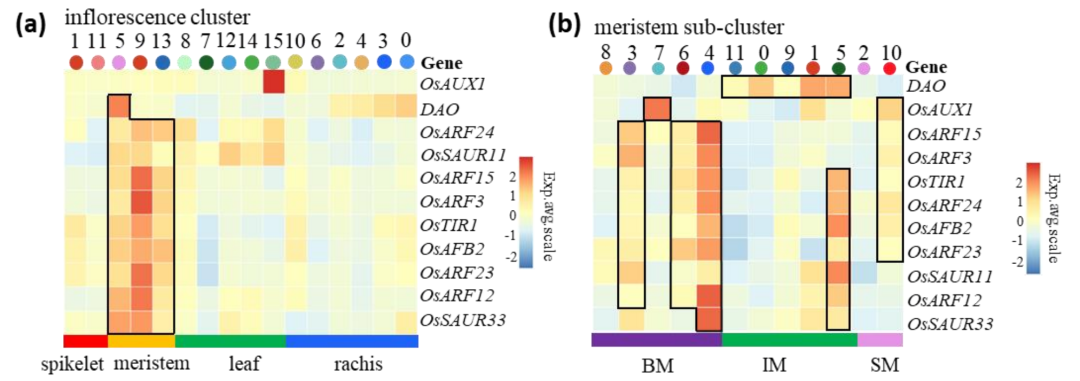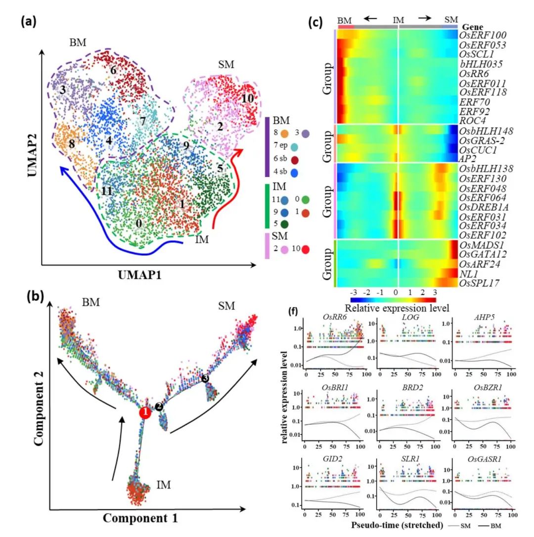 同樣的策略下,烈冰團隊對分生組織進行了深入分析,將其分為花序分生組織(IM)、分枝分生組織(BM)和小穗分生組織(SM)三大類群,并用擬時序分析重建了分生組織的發(fā)育軌跡:IM會向BM 或 SM轉(zhuǎn)化。在此基礎上,對細胞分化的關鍵節(jié)點進行了BEAM分析,將控制側生分生組織轉(zhuǎn)變的調(diào)節(jié)因子分為了4類;同時在利用激素通路相關的基因集合對BEAM分析的結果進行掃描時,發(fā)現(xiàn)不同激素對水稻花序分生組織屬性轉(zhuǎn)換時所起的精細調(diào)控作用。