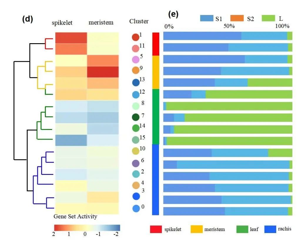 進一步,基于已報道的marker gene,研究人員繪制了heatmap圖,同時聯(lián)合基于GSEA的QuSAGE分析(圖1c)和細胞占比統(tǒng)計(圖1e)等多種方法,將上述16個細胞簇鑒定為小穗、分生組織、葉和花序軸四大細胞類群。為了獲得不同類群的準確功能偏好,烈冰團隊整合了包括TAIR、IRGSP等多個植物學注釋數(shù)據(jù)庫,構建了水稻和擬南芥的本地GO、pathway數(shù)據(jù)庫,并以此進行了全面準確的基因富集分析。結果顯示:與“細胞分裂”相關的基因在分生組織細胞中富集、與“花發(fā)育”相關的基因在小穗組織細胞中富集,這些結果表明了水稻花序早期發(fā)育中存在高度的細胞異質(zhì)性。