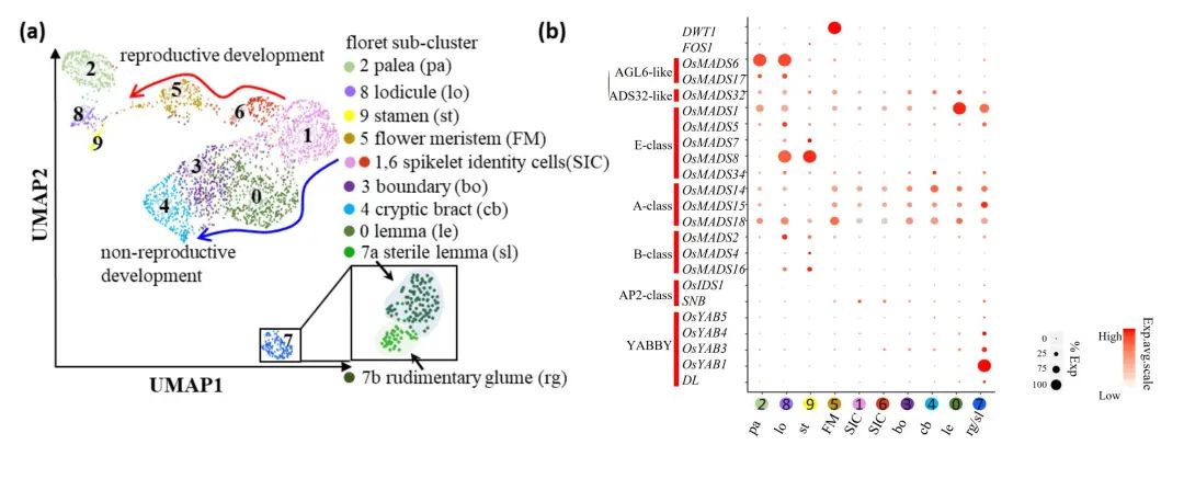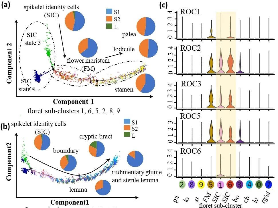 利用monocle算法的擬時序分析,我們重建了花細胞亞群的兩條發(fā)育軌跡:生殖器官(FM、pa、lo、st等花組織)軌跡和非生殖器官軌跡(cb、le、sl, rg等苞葉類附生組織),并證明“真正的”水稻花序包含SIC、FM、pa、lo和st等器官,而rg、sl、le不屬于花。此外,通過表達模式分析并結合已有文獻的報道,發(fā)現(xiàn)ROC/HDG家族基因高度富集的SIC細胞群處于SpM和FM的表皮層,這也得到了原位雜交的驗證。