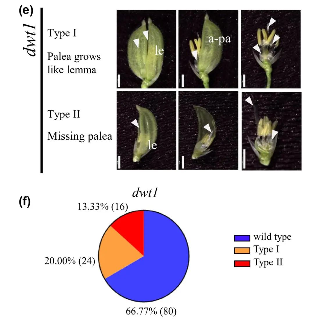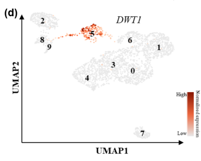 水稻花序組織復雜,不同細胞類型之間異質(zhì)性大,因此需要對同類細胞進行細分分類,以獲得更精細的解析結果,這也是遇到復雜組織時的常見分析策略。在對花細胞進行了細分分群(圖2a)過程中,烈冰團隊結合已報道的marker gene對各個簇進行了細胞類型鑒定(圖2b),得到了包括外稃、內(nèi)稃、漿片和雄蕊在內(nèi)的該時期全部已知水稻花器官,還發(fā)現(xiàn)了小穗屬性細胞(SIC)、FM、邊界細胞(boundary)、隱性苞片(cryptic bract)等新的細胞類群。研究發(fā)現(xiàn),WOX類轉(zhuǎn)錄因子DWT1在FM中高度富集表達,基于該生信分析結果,研究團隊使用遺傳學方法進一步分析了DWT1對花序的影響(圖2e,f),即DWT1參與花序的發(fā)育,調(diào)控水稻FM的活性,這也是DWT1與花發(fā)育功能相關的首次報道。