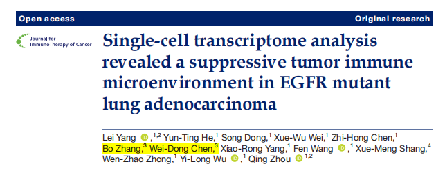 本期,小編為您帶來一篇廣東省人民醫(yī)院肺癌研究所周清教授(通訊作者)和楊蕾博士(第一作者)在Journal for ImmunoTherapy of Cancer雜志(IF=13.751)上發(fā)表的文章,題目為“Single-cell transcriptome analysis revealed a suppressive tumor immune microenvironment in EGFR mutant lung adenocarcinoma”。該文章從細胞成分和功能的角度來揭示EGFR突變型肺腺癌的特異性腫瘤微環(huán)境(TME),為該疾病的免疫治療策略提供了新的思路。