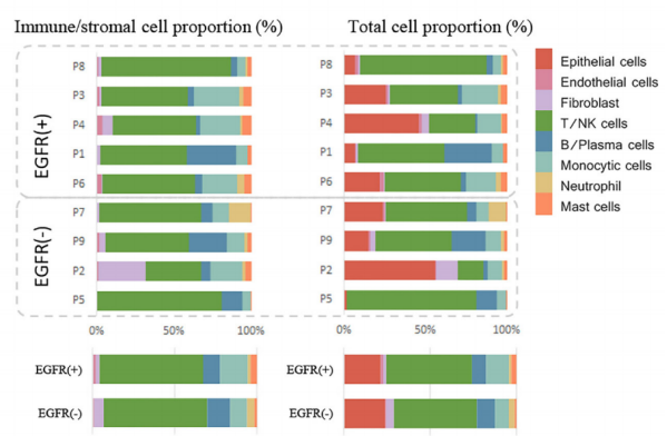 基于NovelBrain生信分析平臺的分析,將獲得的40,799個單細胞確定為8種主要的細胞類型:上皮細胞、成纖維細胞、內(nèi)皮細胞、單核細胞、T/自然殺傷(NK)細胞、中性粒細胞、B/漿細胞和肥大細胞。此外,細胞注釋和占比統(tǒng)計發(fā)現(xiàn),EGFR突變型和野生型樣本的細胞類型占比存在顯著的差異,其中T/NK細胞在兩類腫瘤中的數(shù)量和占比相似,EGFR+樣本中存在更多的單核細胞、肥大細胞和內(nèi)皮細胞,而EGFR-組的中性粒細胞和成纖維細胞比例更高。