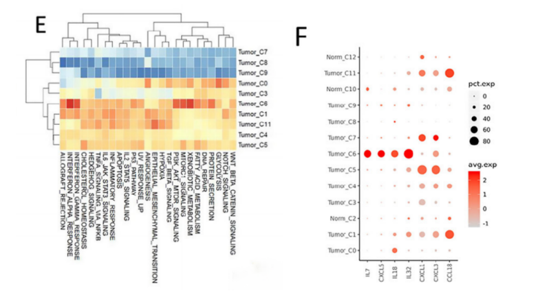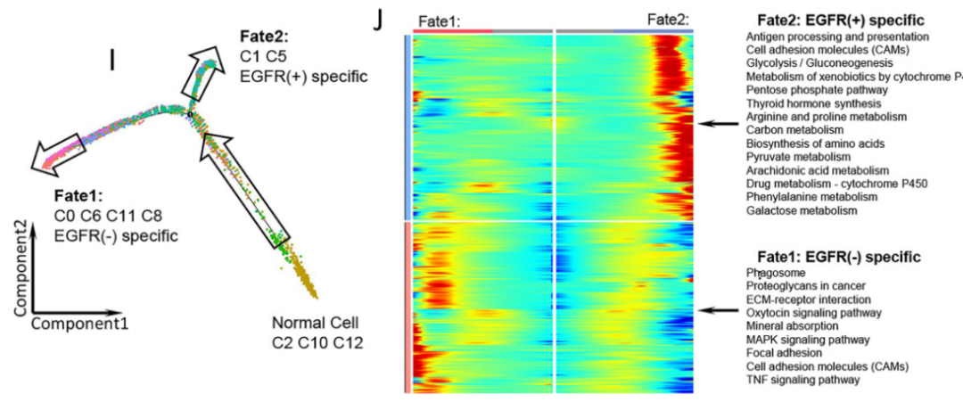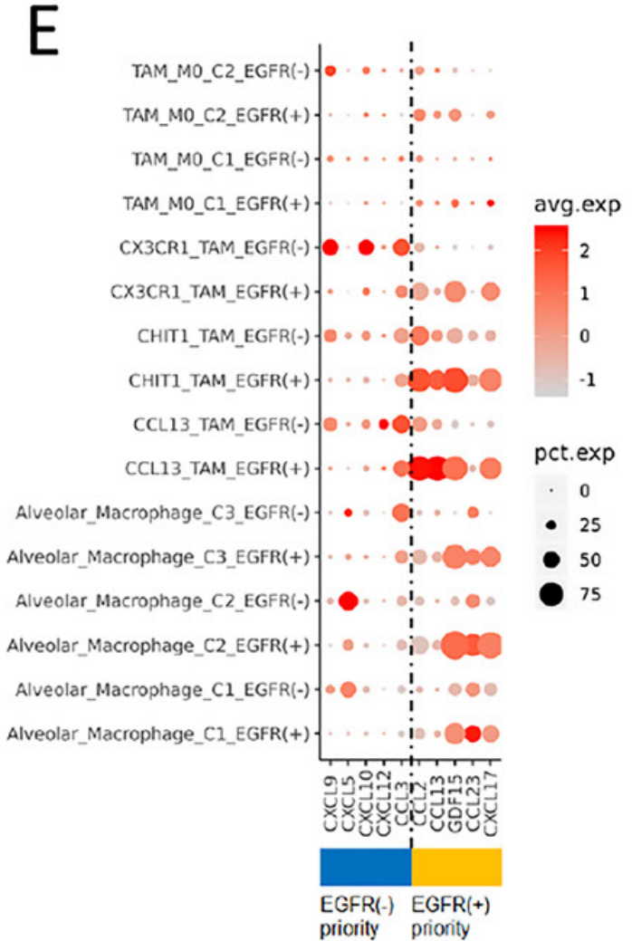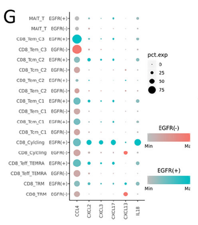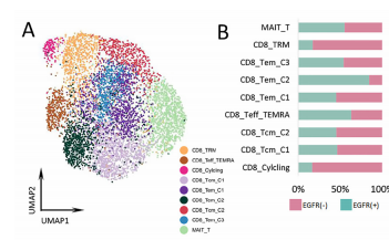 針對上皮細胞,采用sub-Cluster分析將9067個上皮細胞分為13個亞群,進一步采用inferCNV分析將其分為惡性上皮和非惡性上皮兩類,而差異基因表達分析發(fā)現(xiàn),CCL18, CXCL1和CXCL3在EGFR+組的惡性上皮細胞中表達水平更高,可能參與巨噬細胞分化和招募Treg細胞;IL-7和IL-8等基因在EGFR-組的表達相對更高,說明相較于EGFR+組,EGFR-的惡性上皮可能更容易促進CD8+T細胞增殖。