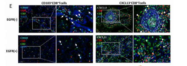 研究團隊利用單細胞測序聯(lián)合公共數(shù)據(jù)分析、多重?zé)晒饷庖呓M化驗證等方法,探索了單細胞水平上EGFR突變肺腺癌的免疫微環(huán)境景觀:多種細胞成分可能通過影響CD8+ TRM抑制了EGFR突變LUAD的特異性腫瘤微環(huán)境,即CD8+TRM的缺陷可能是EGFR突變型LUAD抑制性TME的關(guān)鍵因素。這也為EGFR突變肺腺癌的聯(lián)合免疫治療提供了新的思路。
