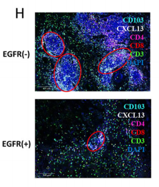 對T細胞的細分發(fā)現(xiàn),CD8+組織駐留記憶細胞(CD8+ TRM)和CD8+增殖T細胞(CD8+cycling T)主要存在于EGFR-組中,且檢測到CXCL13基因(參與促進三級淋巴結(jié)構(gòu)生成)的表達,而EGFR+組中基本沒有表達,說明EGFR+組缺乏CD8+TRM且無法分泌CXCL13促進三級淋巴結(jié)構(gòu)的生成。此外,差異基因表達分析還發(fā)現(xiàn)多種免疫檢查點(PDCD1、TNFRSF9和ICOS等)在EGFR-組的表達,而EGFR+組中很少但高表達一些免疫抑制因子(CCL4、IL-1β等),以上分析結(jié)果也得到了mIHC的驗證,說明EGFR突變肺腺癌更難形成對免疫治療有利的免疫微環(huán)境。