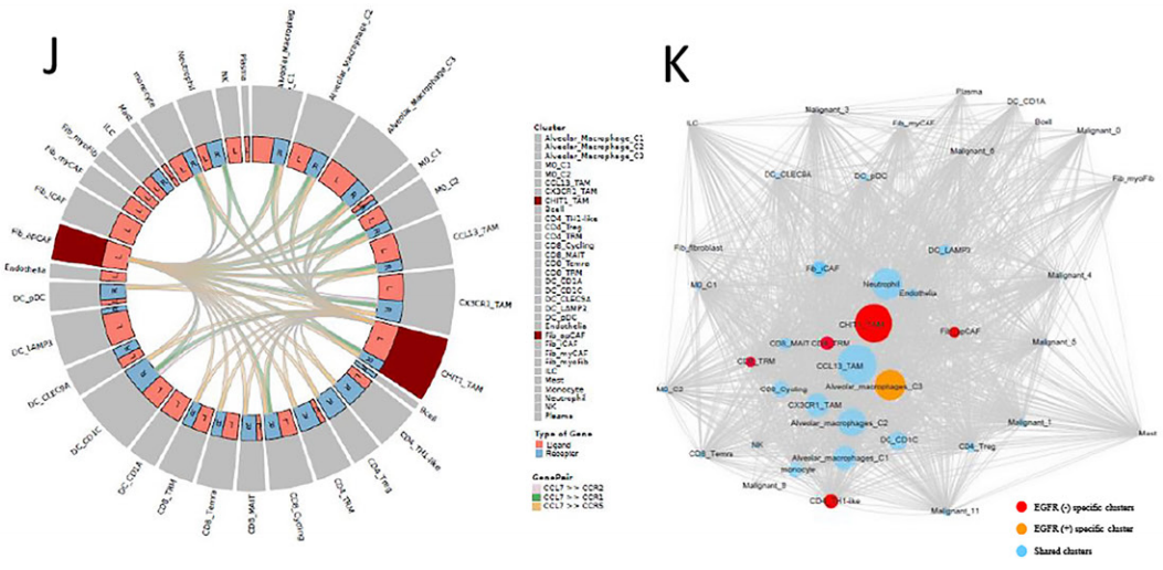 此外,研究團隊發(fā)現(xiàn)CCL2、CCL13、GDF15和CXCL17高表達于EGFR+組中,這些細胞因子多與抑制免疫的微環(huán)境相關(guān)。相比之下,EGFR-組中的腫瘤相關(guān)巨噬細胞(TAM)可能通過表達CXCL9來招募TRM細胞增強腫瘤浸潤效果。進一步的細胞通訊分析發(fā)現(xiàn),巨噬細胞是整個細胞通訊網(wǎng)絡(luò)的關(guān)鍵環(huán)節(jié),其中CHIT1_TAM亞群可能在EGFR-組的腫瘤微環(huán)境中具有很強的調(diào)節(jié)能力,以直接和間接地介導(dǎo)TRM的激活和駐留,而在EGFR+肺腺癌中缺失相關(guān)的TAMs。相似的,EGFR+組也缺失相關(guān)CAF,無法誘導(dǎo)CD8+ T細胞轉(zhuǎn)化為CD8+ TRM細胞,即EGFR突變肺腺癌因缺失TAM和CAF,導(dǎo)致無法招募、駐留和擴展CD8+TRM細胞,進而無法形成三級淋巴結(jié)構(gòu)。