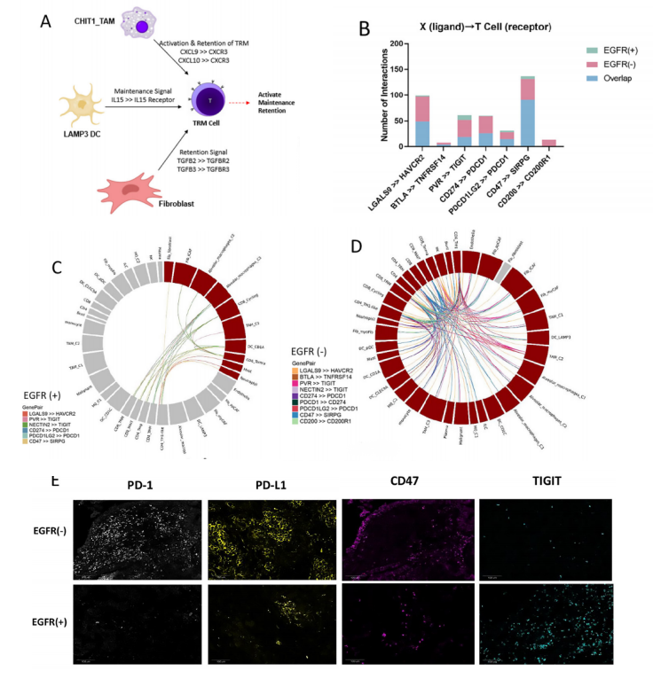 最后,基于CD8+ TRM的重要性,研究團隊采用細胞通訊分析發(fā)現(xiàn),CD8+ TRM與成纖維細胞和CHIT1_TAM等細胞存在相互作用,如成纖維細胞通過TGFB2-TGFBR2 和 TGFB3-TGFBR3 配受體的結(jié)合,促進了CD8+ T轉(zhuǎn)化為CD8+TRM細胞。此外,與EGFR野生型肺腺癌相比,EGFR突變型腫瘤的T細胞和其他細胞類型之間的多種免疫檢查點相關(guān)互作通訊顯著減少(如PD-1和PD-L1),而缺乏CD8+ TRM很可能是導(dǎo)致其形成腫瘤免疫抑制型微環(huán)境的關(guān)鍵因素。