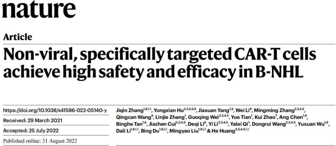 2022年8月31日,烈冰生物合作伙伴華東師范大學生命科學學院張楫欽、劉明耀、杜冰、李大力團隊與浙江大學醫(yī)學院附屬第一醫(yī)院黃河、胡永仙團隊合作在國際著名科研期刊Nature(IF=69.504)上在線發(fā)表了題為Non-viral, specifically targeted CAR-T cells achieve high safety and efficacy in B-NHL的研究論文,證明了開發(fā)的創(chuàng)新性非病毒定點整合CAR-T技術(shù)在治療復發(fā)難治性淋巴瘤的臨床試驗中具有出色的臨床安全性和有效性。另外值得一提的是,張楫欽、劉明耀、杜冰、李大力也是邦耀生物的核心管理團隊成員。