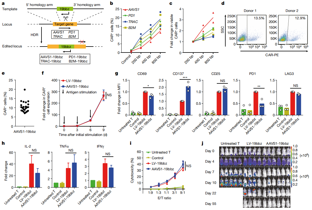 首先,為提高大片段CAR序列在T細胞中的整合效率,團隊通過大量實驗摸索和優(yōu)化,發(fā)現(xiàn)以同源臂長度為800bp的線性雙鏈DNA作為模板,可獲得最好的CAR-T整合效果,并利用AAVS1位點進一步制備了靶向CD19的定點整合型CAR-T細胞(AAVS1-19bbz)。與慢病毒感染CAR-T細胞(LV-19bbz)相比,盡管電穿孔過程會導致一些細胞損傷,但并不影響CAR-T細胞的增殖和高細胞活力,AAVS1-19bbz均能在體外和小鼠體內(nèi)殺傷腫瘤細胞,證明了制備非病毒定點整合的CAR-T細胞的策略是可行的。