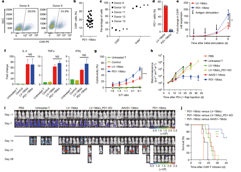 基于多項PD1敲除可以有效增強CAR-T細胞功能的前置研究,團隊將目光聚焦到開發(fā)非病毒PD1定點整合CAR-T細胞上來(PD1-19bbz),希望獲得增強型的非病毒定點整合CAR-T細胞。實驗發(fā)現(xiàn)在PD1位點,CAR序列的整合效率為20%左右(最高30.3%),且PD1-19bbz細胞的增殖能力要優(yōu)于LV-19bbz,PD1下調(diào)并不會影響CAR-T細胞行使腫瘤殺傷功能。