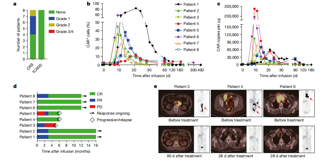 在此基礎(chǔ)上,研究團隊開展了研究者發(fā)起的臨床試驗以評估該方法治療復發(fā)難治性非霍奇金淋巴瘤(r/r B-NHL)的安全性和有效性:8例接受治療的患者中,未觀察到CAR-T治療相關(guān)的神經(jīng)毒性和2級以上的細胞因子風暴,其中7名患者(87.5%)在治療后的觀察期內(nèi)實現(xiàn)了疾病的完全緩解(CR),有5名患者出現(xiàn)持久反應,PD1-19bbz 細胞在體內(nèi)增殖并持續(xù)存在,所有患者的最佳客觀緩解率為100%。值得注意的是,PD1-19bbz在回輸劑量和陽性率較低的條件下也顯示出良好的療效,表明非病毒PD1整合的CAR-T細胞對r/r B-NHL具有很高的安全性和有效性。