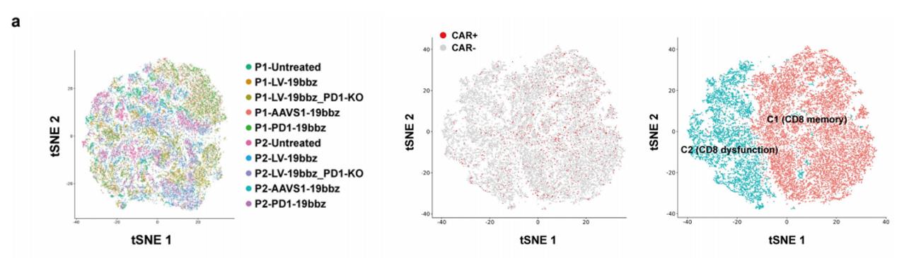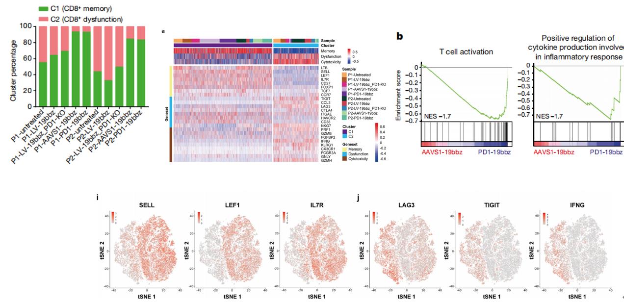 為了進一步了解非病毒PD1整合的CAR-T細胞的特性,團隊利用不同方法制備了CAR-T細胞并進行了單細胞測序,對10個樣本(分組詳見下圖a)中獲得的63789個細胞進行了深入分析,通過CD8+記憶和功能障礙/細胞毒性marker gene將其分為2大類群,從記憶和功能障礙/細胞毒性基因表達情況來看,非病毒基因特異性靶向(PD1-19bbz、AAVS1-19bbz)的細胞中CD8+記憶細胞百分比更高。與AAVS1-19bbz細胞相比,PD1的敲除使PD1-19bbz細胞具有增強的免疫反應能力。