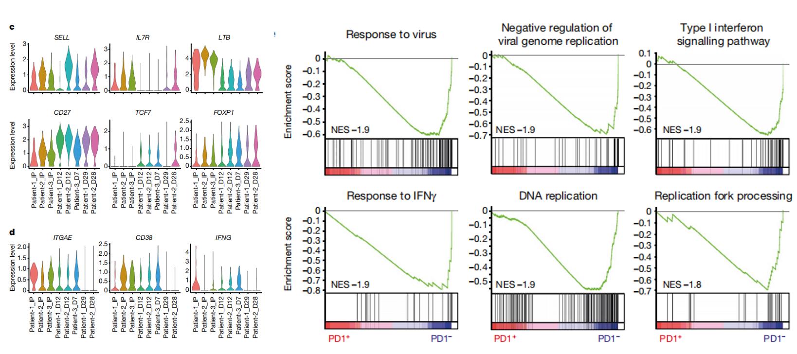 為探究PD1-19bbz細胞在回輸前后的特性,團隊進一步對3例患者不同治療時間節(jié)點的9個臨床樣本也進行了單細胞測序并獲得54774個細胞,數(shù)據(jù)分析結(jié)果顯示:回輸后CD8+CAR+細胞中記憶細胞相關(guān)基因持續(xù)表達(如SELL、CD27等),某些細胞功能障礙相關(guān)基因表達減弱(如ITGAE、CD38等),說明回輸后存續(xù)的CAR-T細胞傾向于維持記憶性細胞的狀態(tài);此外,免疫反應相關(guān)的多個基因在預后好的患者樣本中富集;基因集富集分析 (GSEA) 表明,PD1低表達的CAR+細胞具有更高的增殖和免疫反應能力,這為全面了解PD1-19bbz回輸前后狀態(tài)的變化并解釋其臨床表現(xiàn)提供了數(shù)據(jù)支持。