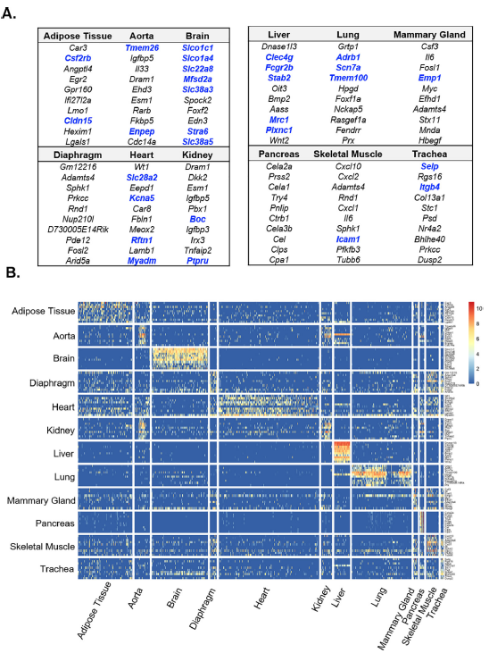 為了定義組織特異性ECs的標(biāo)記物,研究團(tuán)隊檢測了各器官ECs中排名前十的差異基因。如上所示,大腦和肝臟的ECs表達(dá)獨(dú)特的基因集,而這些基因幾乎無法在其他器官的ECs中檢測到。相反,表征心臟、膈肌、脂肪組織、骨骼肌和乳腺ECs的差異基因則沒有那么特異。這些發(fā)現(xiàn)證實了scRNA-seq在識別組織特異性ECs的轉(zhuǎn)錄組特征方面的效用。