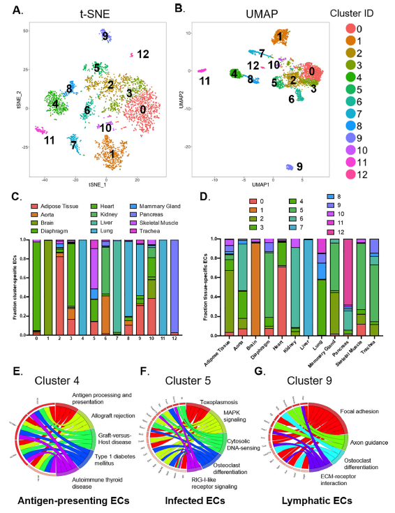 研究團(tuán)隊使用subCluster分析來識別ECs的細(xì)分亞群,發(fā)現(xiàn)它們可能獨(dú)立于胚胎組織,并確定了13個ECs亞群,且不同亞群在每個器官的百分比和絕對數(shù)量存在差異。