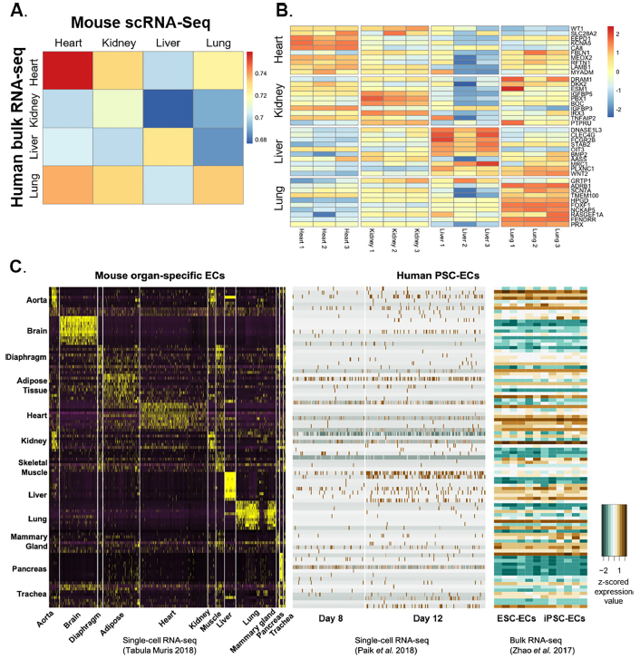 那么這些發(fā)現(xiàn),在人類ECs中是否成立呢?為了確定在小鼠ECs中的發(fā)現(xiàn)與人類內(nèi)皮生物學(xué)的相關(guān)性,研究團(tuán)隊將小鼠數(shù)據(jù)與人類胎兒器官(如心臟、腎臟、肝臟和肺)中分離的ECs bulk RNA-seq數(shù)據(jù)進(jìn)行了聯(lián)合分析,當(dāng)比較來自同一器官的ECs時,成年小鼠和人類胎兒ECs基因表達(dá)的相關(guān)性往往最強(qiáng)。這些發(fā)現(xiàn)表明ECs中組織特異性的轉(zhuǎn)錄組學(xué)表現(xiàn)在小鼠和人類之間相對保守。