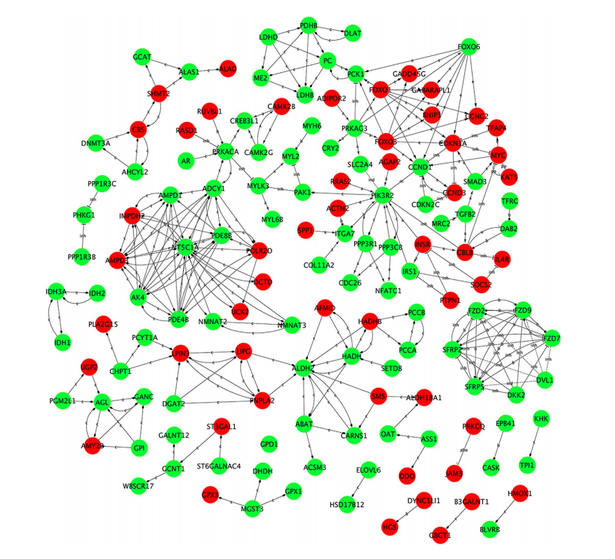 研究中,常常會(huì)發(fā)現(xiàn)差異基因過(guò)多,并且所屬信號(hào)通路也很復(fù)雜,難以將相關(guān)基因聯(lián)系起來(lái)并找到“核心”基因。烈冰團(tuán)隊(duì)整合基因間相互作用關(guān)系,并采用網(wǎng)絡(luò)圖展示差異基因間復(fù)雜的互作網(wǎng)絡(luò)/信號(hào)傳遞網(wǎng)絡(luò),幫助研究者快速定位到“核心”基因。