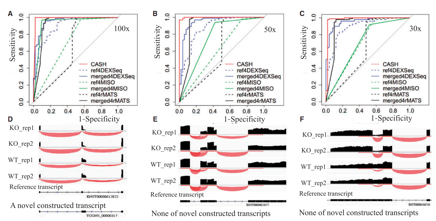 烈冰團(tuán)隊(duì)利用Flux模擬器模擬了一系列數(shù)據(jù),其中包含已有注釋的以及新的差異可變剪接事件,測(cè)序深度分為30x,50x和100x。結(jié)果顯示MISO,rMATS以及DEXSeq在使用重建后轉(zhuǎn)錄本的情況下,其檢測(cè)效率要高于使用參考基因組,但還是顯著低于CASH。即使是在30x的數(shù)據(jù)量下,CASH依舊能夠維持著極高的敏感性及特異性。