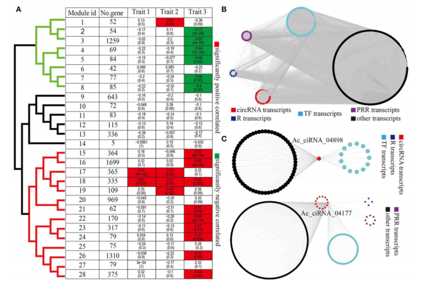 對(duì)于已知注釋信息進(jìn)入深入的分析挖掘之后,研究者往往希望能夠找到更多的創(chuàng)新點(diǎn)。烈冰團(tuán)隊(duì)基于轉(zhuǎn)錄組基因的實(shí)測(cè)表達(dá)值,為研究者構(gòu)建基于統(tǒng)計(jì)學(xué)和“圖論”原理的共表達(dá)網(wǎng)絡(luò),通過(guò)研究處理前后共表達(dá)網(wǎng)絡(luò)拓?fù)浣Y(jié)構(gòu)變化,了解基因間的潛在關(guān)系和規(guī)律,進(jìn)一步找到實(shí)驗(yàn)處理前后發(fā)生改變的關(guān)鍵基因進(jìn)行深入研究。