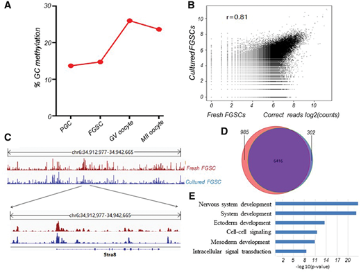 為了進(jìn)行雌性生殖細(xì)胞發(fā)育的全基因組DNA甲基化分析,研究者首先對新鮮分離的FGSC進(jìn)行MeDIP-Seq,并分析了PGC, GV卵母細(xì)胞和MII卵母細(xì)胞的全基因組DNA甲基化的最新數(shù)據(jù)。結(jié)果表明,PGC具有相對較低的甲基化水平。性別分化后,FGSC也維持較低的甲基化,同時(shí)增加甲基化并分化成GV和MII卵母細(xì)胞(圖2A),這與RNA-seq得到的基因表達(dá)數(shù)據(jù)形成呼應(yīng)。為了明確新鮮分離的FGSCs與培養(yǎng)的FGSCs之間是否存在表觀遺傳模式改變,研究者對這兩個(gè)群體進(jìn)行了全基因組DNA甲基化分析,可以觀察到二者之間顯示出非常相似的DNA甲基化模式(圖2B),并由染色體標(biāo)度和Stra8基因座證實(shí)(圖2C)。接下來,研究者分析了新鮮和培養(yǎng)的FGSC基因組中CpG島(CGIs)的甲基化狀態(tài),發(fā)現(xiàn)培養(yǎng)的FGSCs中超過95%的甲基化CGIs可在新鮮的FGSC中被重新捕獲(圖2D))。對共享的甲基化CGI進(jìn)行了功能注釋,發(fā)現(xiàn)富集功能主要與體細(xì)胞發(fā)育有關(guān)(圖2E)??傊?,這些觀察結(jié)果表明培養(yǎng)的FGSC的DNA甲基化模式幾乎與新鮮FGSC的DNA甲基化模式相同。