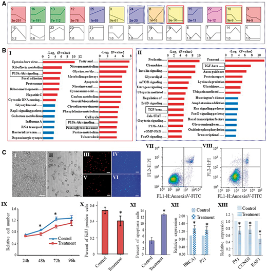 為了探索雌性生殖細(xì)胞發(fā)育過程中涉及的生物過程相關(guān)pathway,研究者使用基于貝葉斯模型的聚類方法來分析從PGC到MII卵母細(xì)胞的DEGs,確定了13種重要的模型表達(dá)趨勢(圖3A),其中趨勢1和10表現(xiàn)出從PGCs到MII卵母細(xì)胞的逐漸下降趨勢,因此推斷其與FGSCs的自我更新有關(guān)。相反,趨勢8和24表現(xiàn)出從FGSC到GV卵母細(xì)胞的增加趨勢,表明這兩組與FGSC分化有關(guān)。有趣的是,趨勢1/10共享一個(gè)途徑PI3K-AKT(圖3B I),而趨勢8/24共享TGF-β途徑(圖3B II),提示這兩種途徑分別在維持自我更新和調(diào)節(jié)FGSCs分化中起著關(guān)鍵作用。 為了證實(shí)PI3K-AKT信號通路在FGSC自我更新和存活中的作用,研究者通過AKT抑制劑IV和染色實(shí)驗(yàn)證實(shí)AKT抑制劑IV處理的FGSC中凋亡細(xì)胞和死細(xì)胞的比例增加(圖3C)。對于TGF-β途徑,先前的研究將BMP4鑒定為PGC分化的關(guān)鍵調(diào)節(jié)劑[32],表明TGF-β超家族可能在小鼠卵子形成過程中調(diào)節(jié)FGSC分化,該發(fā)現(xiàn)與通路分析的結(jié)果相匹配,進(jìn)一步驗(yàn)證了RNA-seq數(shù)據(jù)。