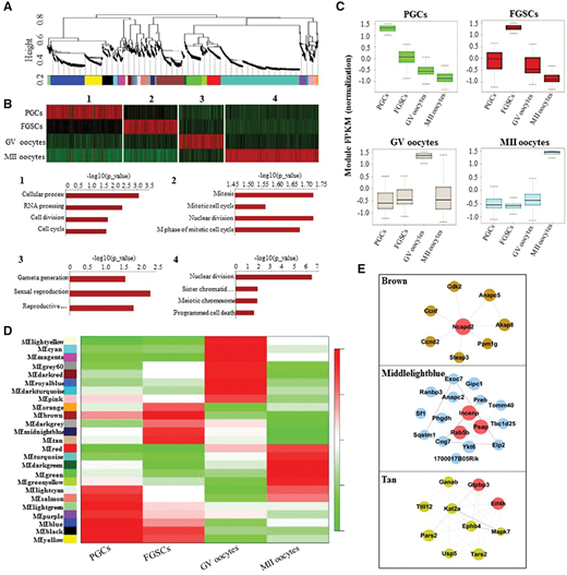 為了研究雌性生殖細(xì)胞發(fā)育階段與特定基因調(diào)控模塊之間的共表達(dá)關(guān)系,研究者進(jìn)行了加權(quán)基因共表達(dá)網(wǎng)絡(luò)分析(WGCNA),發(fā)現(xiàn)雌性生殖系發(fā)育涉及25個(gè)共表達(dá)模塊(圖4A))。在類似功能模塊合并后,獲得了四個(gè)復(fù)合模塊,這些模塊顯示了階段特異性的表達(dá)模式。GO富集顯示這些模塊涉及一些階段特異性生物過程,如RNA加工,細(xì)胞分裂和細(xì)胞周期(PGCs),有絲分裂細(xì)胞周期和核分裂(FGSCs),配子生成和有性生殖(GV卵母細(xì)胞),減數(shù)分裂染色體分離和程序性細(xì)胞死亡(MII卵母細(xì)胞)(圖4B)。然后研究者檢測了發(fā)育期間模塊表達(dá)的分布,發(fā)現(xiàn)PGC模塊在發(fā)育過程中逐漸降解,而從FGSC到GV卵母細(xì)胞或從GV到MII卵母細(xì)胞的轉(zhuǎn)變中的模塊顯示出急劇退化和持續(xù)激活(圖4C)。