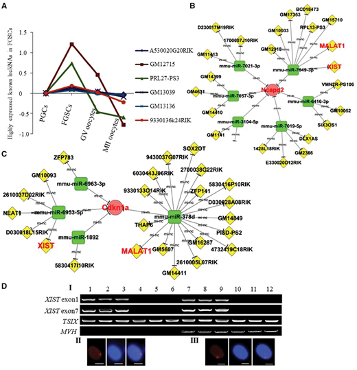 miRNA是哺乳動(dòng)物發(fā)育和體內(nèi)平衡的重要調(diào)節(jié)劑,lncRNA通過與miRNA的結(jié)合調(diào)節(jié)其相應(yīng)的mRNA。本研究中,研究者使用了三個(gè)核心基因(Ncapd2,CDKN1A和Rab5b),兩個(gè)已知的生殖系標(biāo)記基因(MVH和C-KIT)和一個(gè)干細(xì)胞相關(guān)基因(LHX1)構(gòu)建交互網(wǎng)絡(luò),獲得了功能特征性的lncRNA,包括XIST和MALAT1(圖5B,C)。使用單細(xì)胞RT-PCR,研究者在FGSC階段鑒定到XIST的表達(dá)(圖6D),這與RNA-Seq數(shù)據(jù)一致。值得注意的是,研究者發(fā)現(xiàn)ZFP783可通過miR-6963-3p與FGSCs中的MVH和CDKN1A相互作用。由于CDKN1A已被證實(shí)對維持FGSCs很重要(圖3C XII),因此揭示了ZFP783可通過miRNA海綿效應(yīng)來對FGSC分化和有絲分裂細(xì)胞周期發(fā)揮調(diào)節(jié)作用。